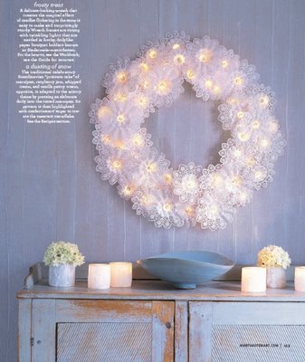 É, esta aqui eu já adorei por causa do efeito das luzinhas. Esta é feita com aqueles plasticos que usamos para doces de festas, mas fiquei imaginando como as luzinhas LED azuis que tenho aqui iriam se comportar no miolo de rosas brancas naquele primeiro modelo. A imagem vem do blog da Maria Dorotéia.