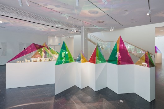Fico aqui pensando: se este material colorido (provavelmente acrílico) provoca todos estes multireflexos no teto, imagine a sensação do observador tendo de fazer uma ginástica para encontrar um ponto de observação onde os reflexos não ocorram e ele consiga observar o que está exposto. Percebam também que os próprios reflexos provocam a projeção de sombras das luminárias sujando ainda mais o teto do ambiente.