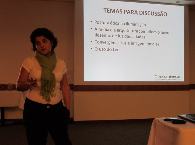 Começou na sexta feira a tarde com uma palestra da Jamile Tormann falando sobre mercado e projetos de iluminação. Super como sempre.