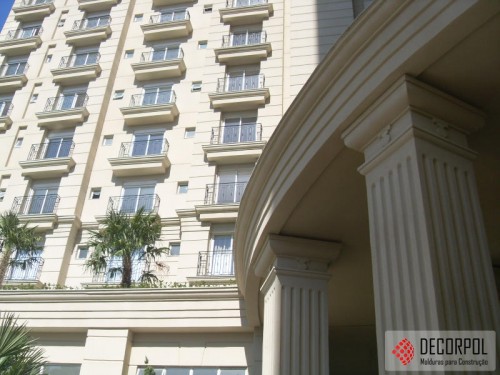 Moldura em EPS para fachada somente no EPS cru, sem tela estrutural ou argamassa. Isto garante um melhor custo x benefício para construtoras que necessitam aplicar grandes quantidades de molduras em suas obras.