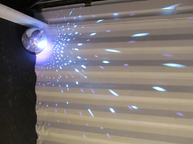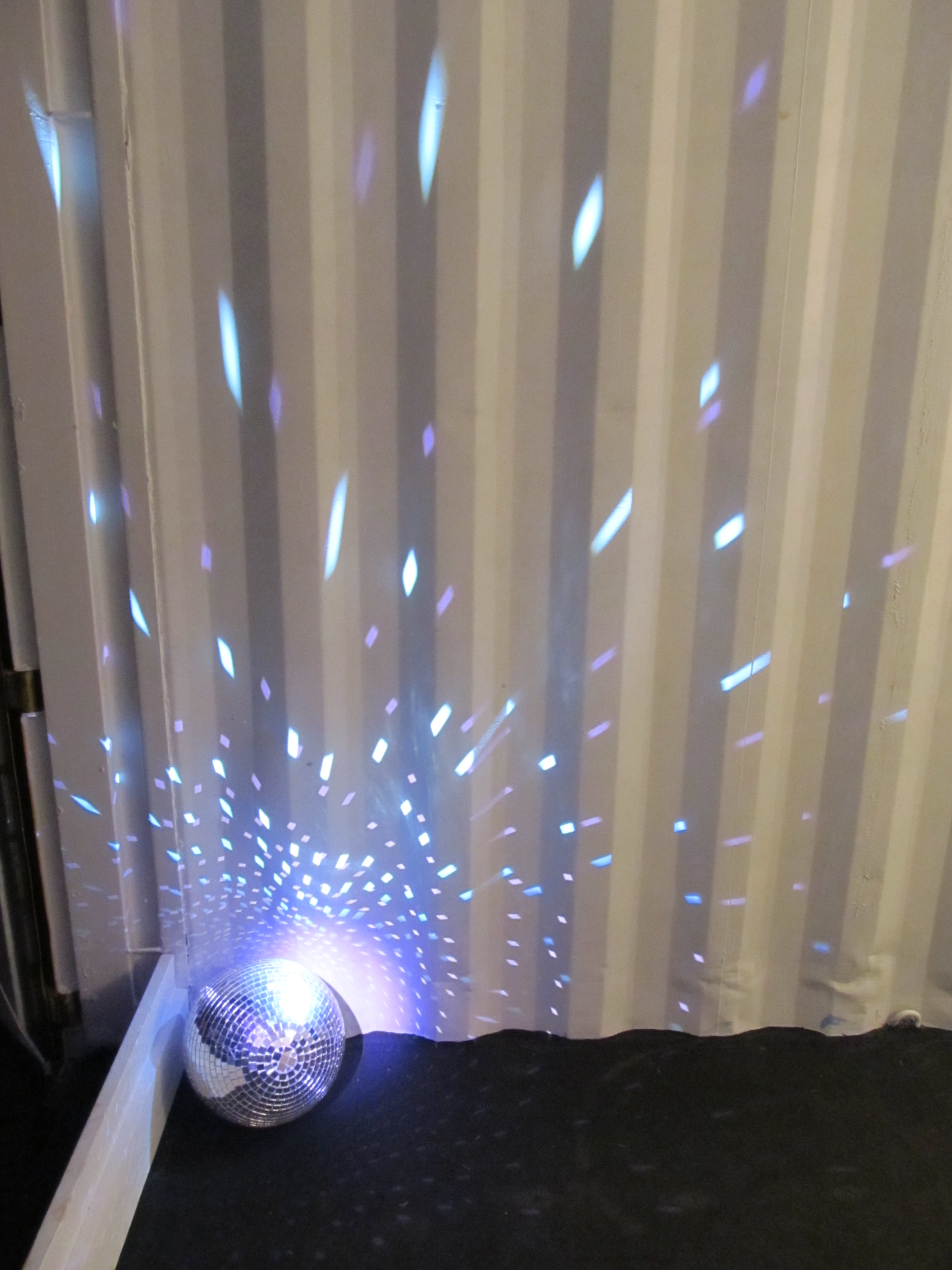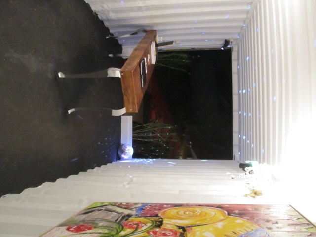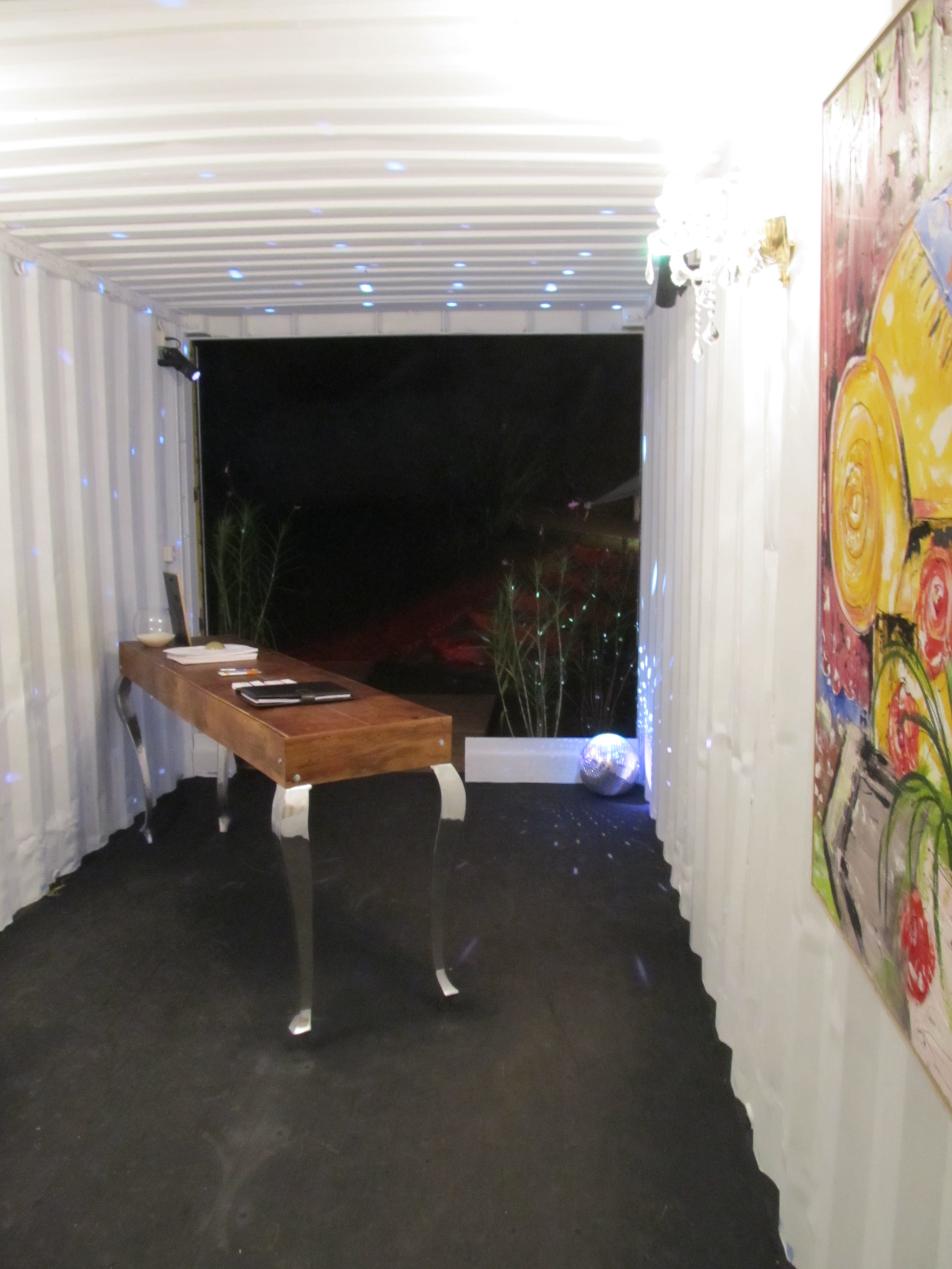 Um espaço bastante minimalista e poderia dizer até mesmo brutalista. Procuramos não esconder os defeitos do container já bastante surrado. Apenas lançamos uma demão de tinta branca. Para iluminar a Jamile, gerente da Via Light aqui de Londrina, nos forneceu duas arandelas de cristais bem clássicas cada uma com duas velas. Complementei lançando um efeito através de dois spots beam (LED) projetando sobre um globo espelhado colocado no chão bem na entrada. Mesmo com as arandelas acesas, os reflexos ficam visíveis dentro do container. Também temos uma tela maravilhosa cedida pela Roni Brunetto que fechou impecavelmente o ambiente. Utilizei uma sobra das molduras em EPS que a Decorpol mandou para o muro e fiz um barrado na entrada do container.