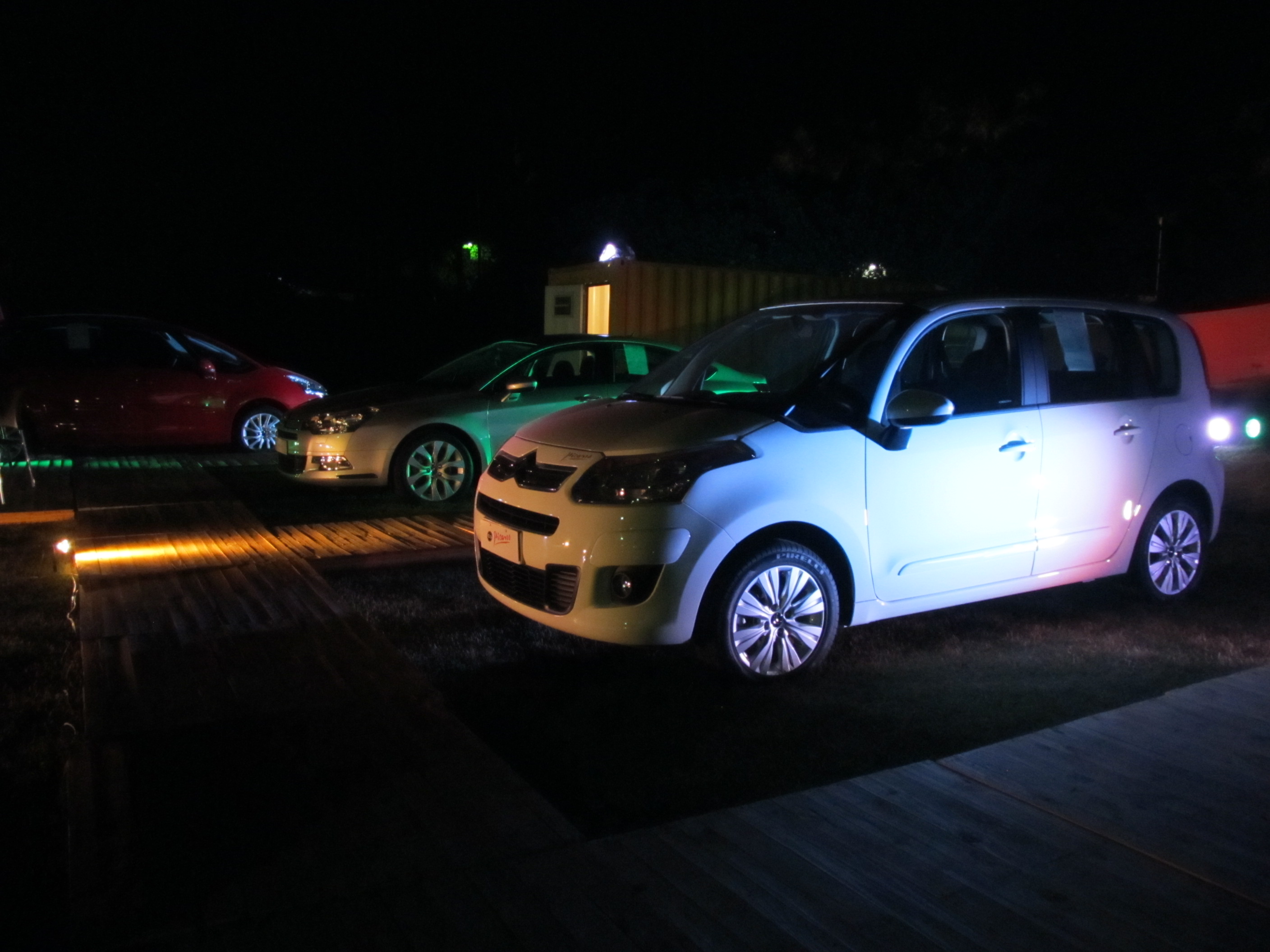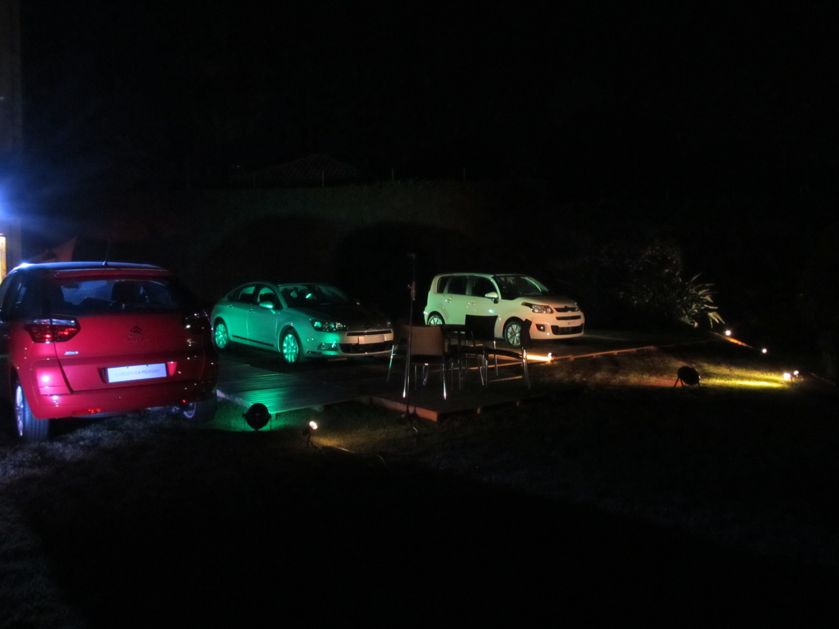 Ocupa a maior parte do gramado. Foram dispostos os palets para fazer o caminho de acesso e locados os tres carros que a Vernier Citroen está expondo.