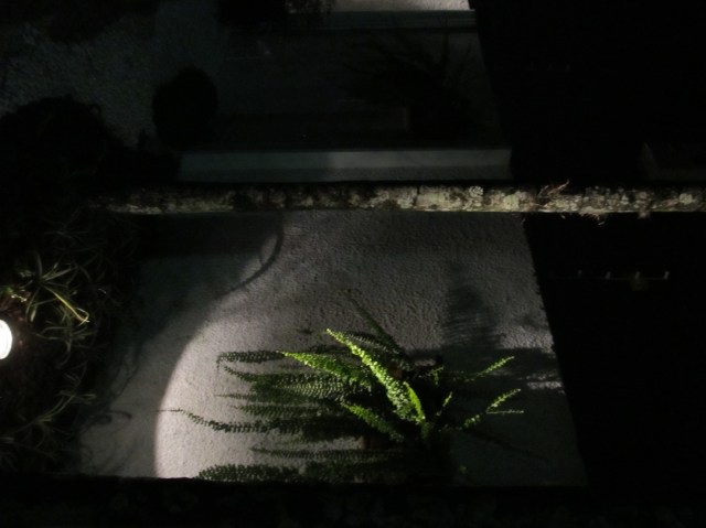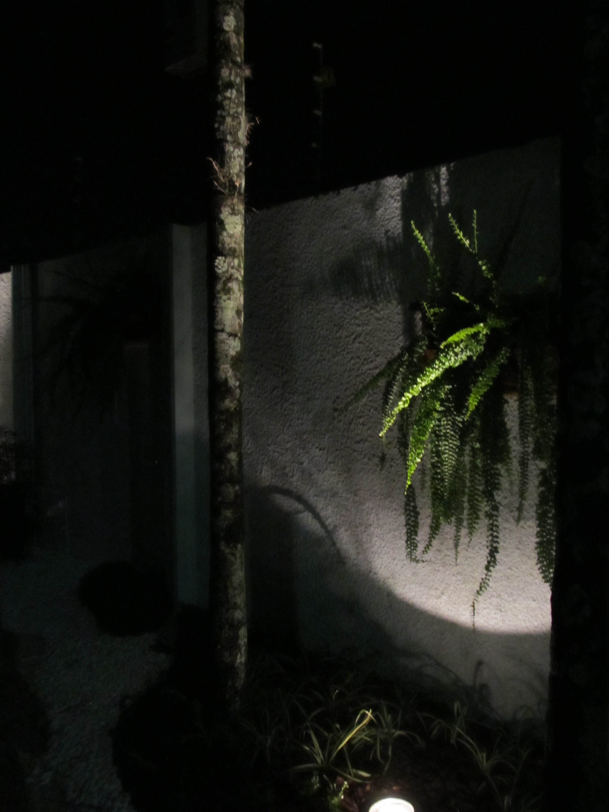 Para esconder (ou ao menos suavizar esteticamente) o quadro de luz, optamos por vasos com samambaias afixados acima dele onde, as folhas, não atrapalham o acesso ao mesmo. Este mesmo elemento aplicamos em outros pontos do muro para não chamar a atenção justamente em cima do problema. Poucas pessoas perceberam que tinha um quadro de luz ali.