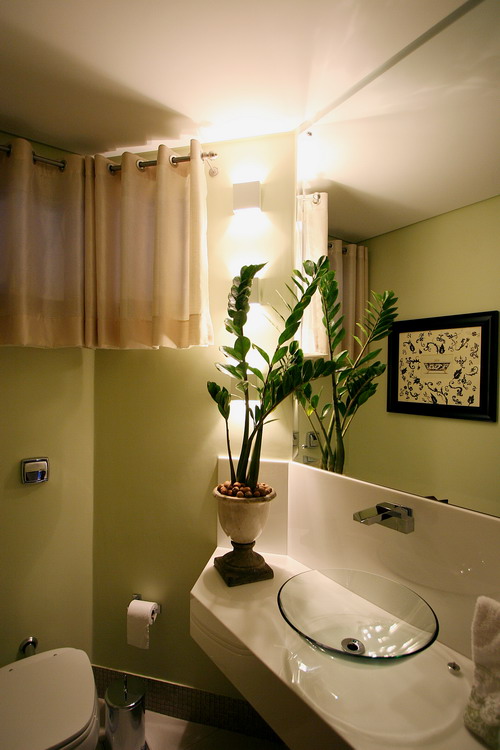 Lembro que as lâmpadas halógenas esquentam demais atingindo temperaturas absurdas durante o funcionamento. É só chegar perto de uma luminária qualquer que use halógena e perceberão isso. E a pessoa que projetou este banheiro vem e coloca uma cortina de tecido a centímetros da luminária… Depois, quando acontece um incêndio a responsabilidade certamente será do eletricista que instalou mau e porcamente a luminária e provocou um curto né??