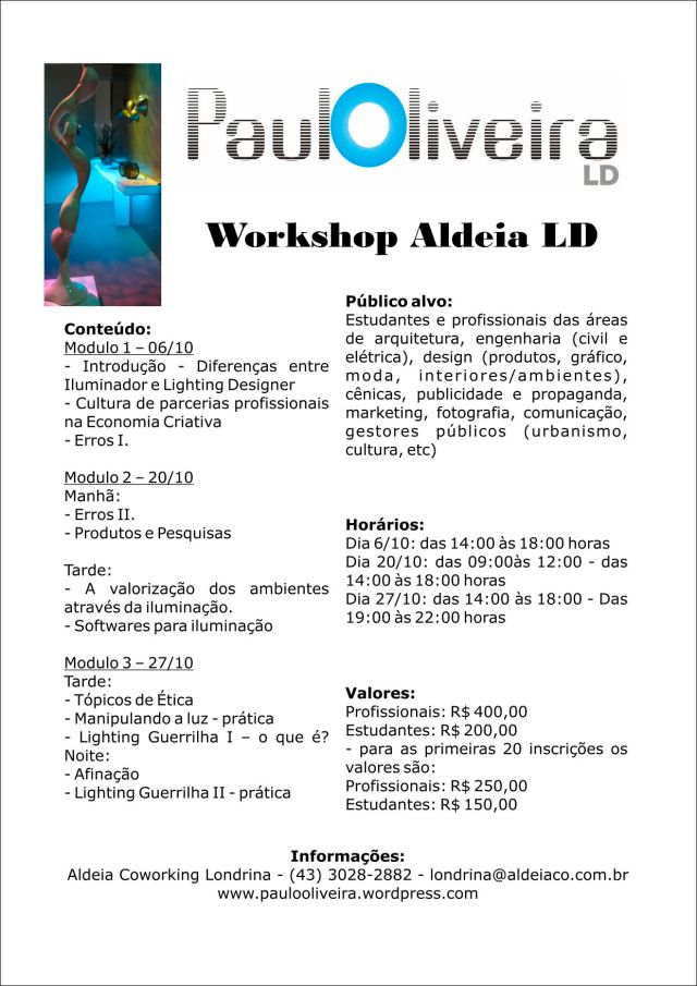 Este workshop tem como objetivo corrigir a cultura sobre o Lighting Design, levando a informação correta sobre esta especialidade. Mostrar as diferenças entre iluminação e Lighting Design. Conscientizar sobre a necessidade da especialização na área e a cultura de parcerias profissionais para a construção de uma comunidade criativa.