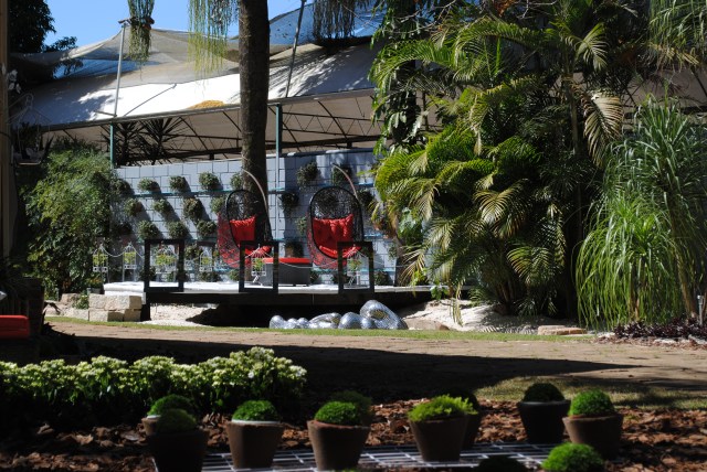 Escolhemos um jardim externo bem amplo. Como é ponto de passagem obrigatória para os visitantes (além de ser uma das áreas mais visitadas da feira) elegemos um ponto fundamental para a conceituação do projeto: ergonomia.