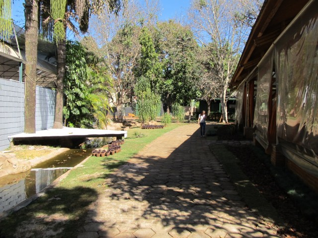 Também optei por realizar um projeto de iluminação que não colocasse os visitantes em risco. Toda a área proxima à circulação está iluminada com luminárias solares (em led) fornecidas pela PedLed, ou seja, não há fiação elétrica no entorno do caminho e nas áreas acessíveis aos visitantes. A parte elétrica ficou no lado oposto do lago (inacessível) e afixada no beiral da cobertura do restaurante.