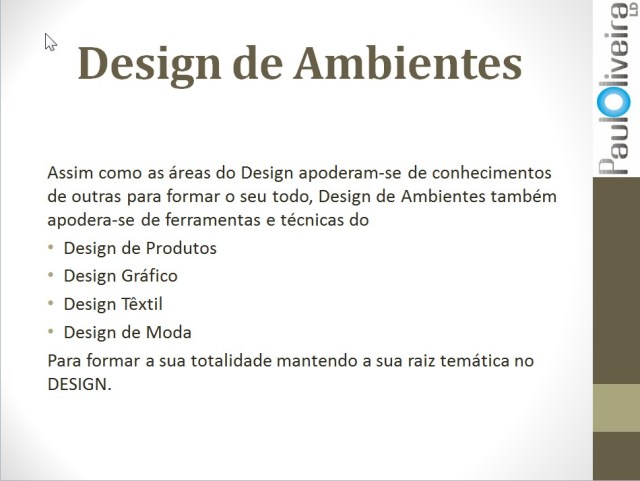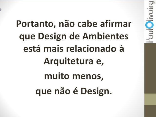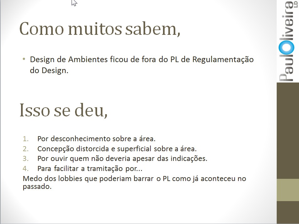 A seguir, a apresentação que fiz ontem (24/11) em São Paulo no Design na Brasa, na mesa sobre a regulamentação profissional, em defesa da área de Design de Interiores/Ambientes como uma especialidade do Design. Colocarei as imagens do PPT e farei alguns comentários sobre cada uma delas.
