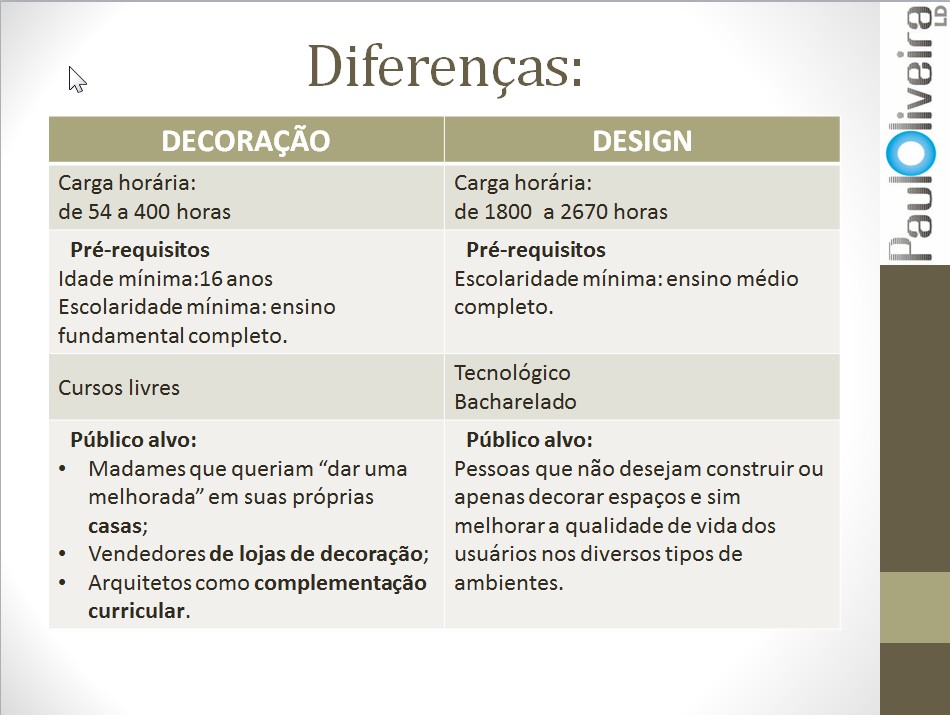 Como deve ser reconhecida a área de atuação é um pouco complicada, pois atuo na área da construção civil há alguns anos e não faz diferença se é denominado Decoração ou Design de Interiores ou Design de Ambientes para mim. Sou graduada em Decoração pela UFBA-BA, e o curso antes era denominado como Superior de Decoração, atualmente Design de Interiores. Pertence à unidade de Belas Artes e a duração do curso mínimo era de quatro anos e a minha carga horária foi de 2996 horas. Cursei disciplinas das áreas de artes, arquitetura, engenharia, sociologia e filosofia, além das disciplinas base do curso… (Fico um pouco chateada quando vejo esta desvalorização da denominação do curso quando se refere ao termo Decoração).