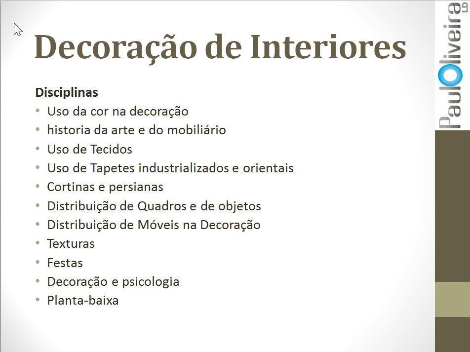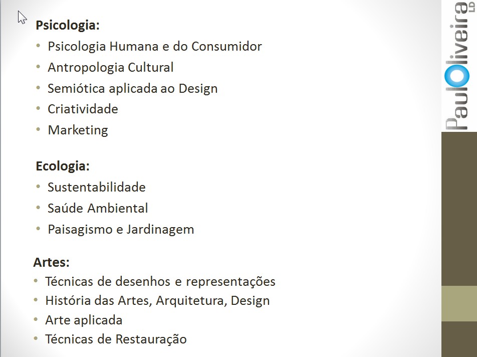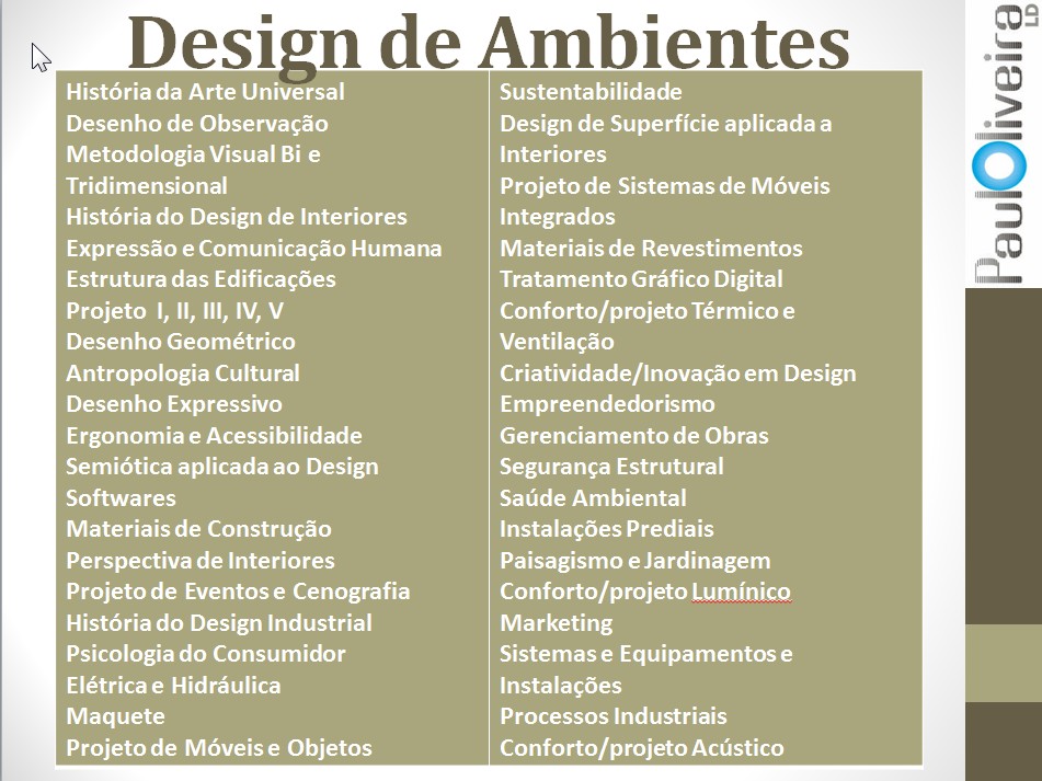Ok, nem todos os cursos oferecem todas estas disciplinas ou a quantidade de módulos. Mas na essência é esta a Matriz dos cursos de Design de Interiores/Ambientes.