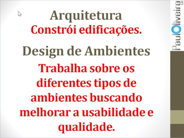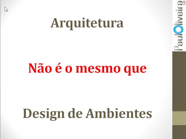 Isso se deve às velhas questões de cerceamento profissional impostas pelo termo “interiores” (entre quatro paredes) e as consequentes limitações profissionais. Os conhecimentos adquiridos por nós nos anos de faculdade nos habilitam a trabalhar além desta barreira imposta pelo termo “interiores”. Portanto, se você é formado, passe a adotar profissionalmente o termo AMBIENTES.