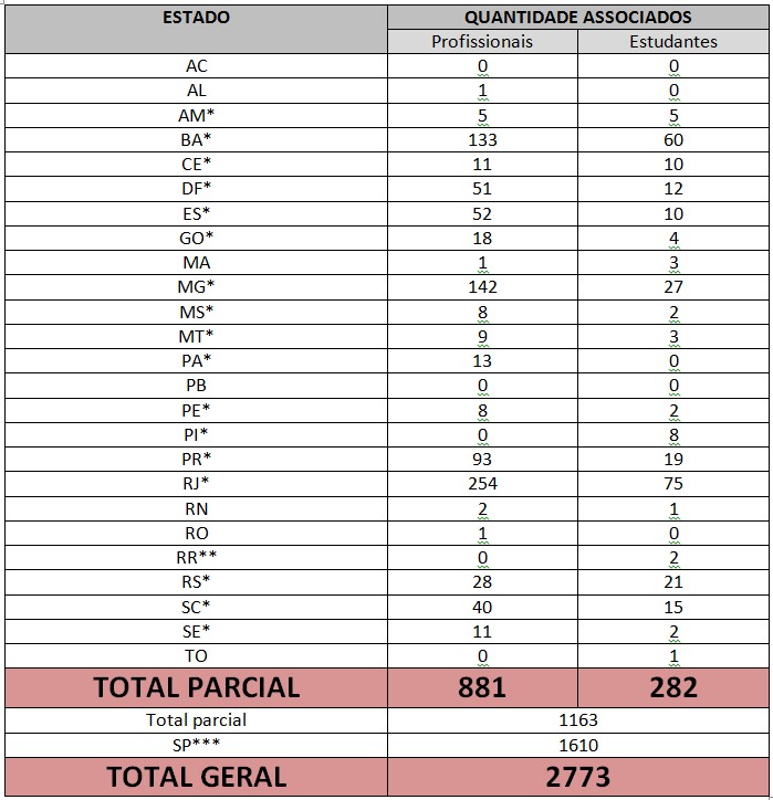 *** Pelo numero elevado de associados me poupei de contar tendo de fazer a seleção visual na lista buscando identificar entre profissionais e estudantes cadastrados e misturados sem a possibilidade de filtrar os resultados. Porém percebe-se uma alta quantidade de nomes duplicados (mais de 40 numa rápida olhada em menos da metade da lista completa do estado).