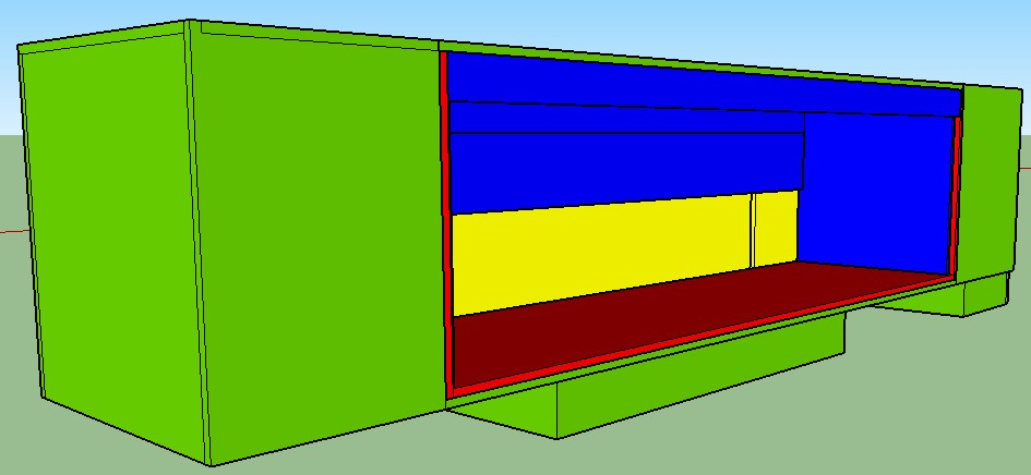 O baú do projeto terá comp. 14m, alt. 3,37m e larg. 2,60m. O primeiro baú terá um sistema de gaveta hidráulica horizontal que amplia a largura total do mesmo para o lado esquerdo, que por sua vez, abre outra gaveta, no sentido vertical, dando altura para a caixa cênica (para o palco). Esses deslocamentos serão dados pelo sistema hidráulico. haverá também o deslocamento horizontal da lateral direita para proporcionar mais profundidade e condições de alocar adequadamente a cozia e os camarins.