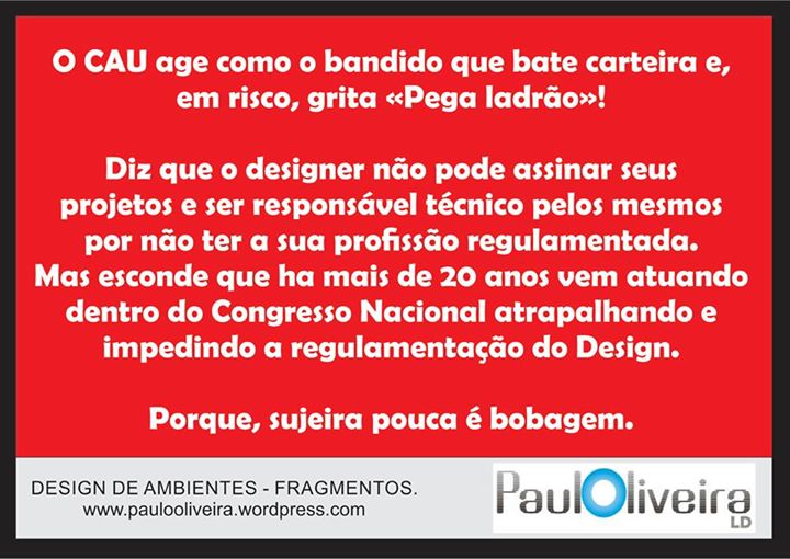 “Todas as matérias por vocês divulgadas atacando outras profissões, especialmente os designers, demonstram equivocadamente os valores pessoais de uns poucos (dirigentes dos órgãos ligados à Arquitetura brasileira), em detrimento de tantos colegas Arquitetos (com A maiúsculo mesmo), amigos e parceiros históricos de trabalho que tanto dignificam sua profissão.