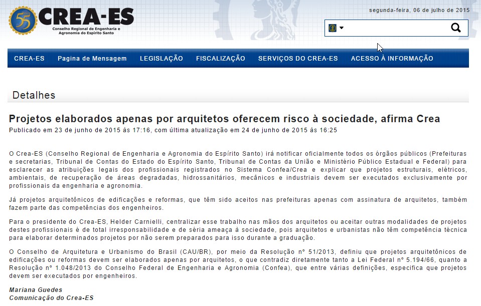 Bom, não bastando isso ainda devemos analisar o perrengue provocado pela Resolução n° 51. Essa insanidade provocou um mal estar não apenas com os designers mas, especialmente com os engenheiros e o CREA. E, da mesma forma, passaram a divulgar notas para todos os lados atacando os engenheiros também: